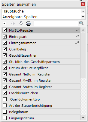 Der Arbeitsbereich enthält eine Tabelle mit den ausgefilterten MwSt.-Register-Einträgen. Sie können das Aussehen der Tabelle im Kontextmenü anpassen. Hier sind die folgenden Funktionen verfügbar: