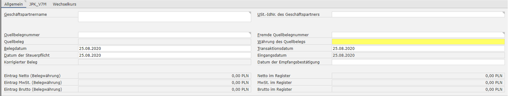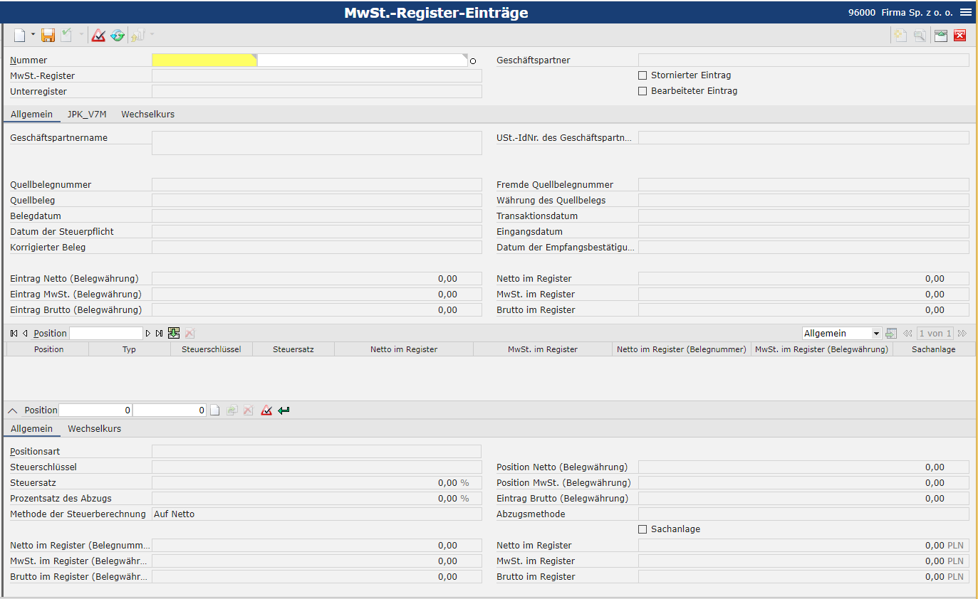Die Registerkarte JPK_V7M des jeweiligen MwSt.-Eintrags enthält Informationen, die bei der Erstellung der JPK_V7M-Erklärung verwendet werden.