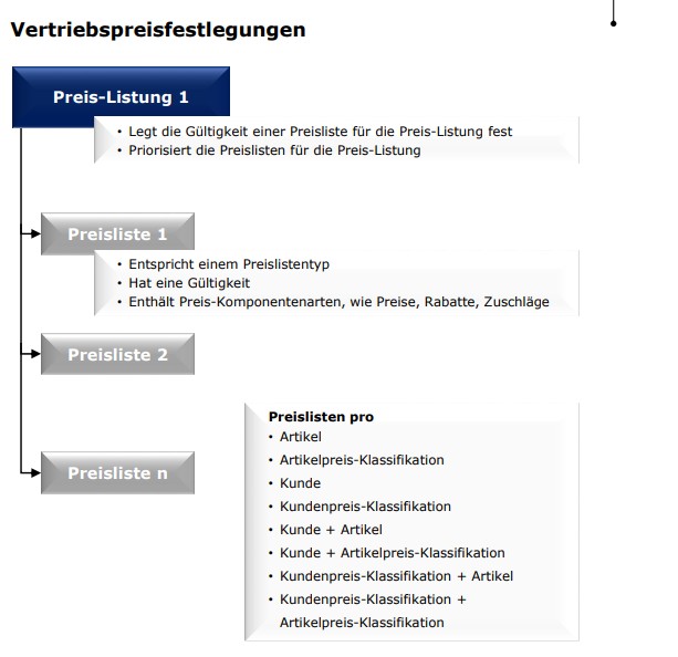 In einer Preisliste werden die Preiskomponenten (Preise, Rabatte und Zuschläge) zur Preisermittlung festgelegt. Dafür enthält eine Preisliste verschiedene Preislistenebenen, z. B. eine Ebene für Kunden und eine für die Kombination „Artikel + Kunde“. Unterschieden werden Standardpreisliste und Aktionspreisliste. Preislisten werden in Preis-Listungen gruppiert und mit Prioritäten versehen, welche die Preisermittlung beeinflussen.