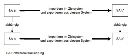 Zwischen den Softwareaktualisierungen, die aus einem System exportiert wurden, bestehen unvermeidliche Abhängigkeiten. Eine Softwareaktualisierung kann erst im Ziel-System installiert werden, wenn alle Softwareaktualisierungen von denen sie abhängig ist, in dieses System importiert wurden. Dadurch wird sichergestellt, dass sich auf einem System immer ein technisch konsistenter Stand an aktiven Entwicklungsobjekten befindet.