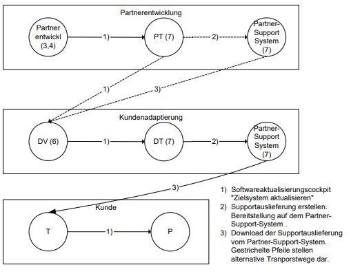 Ein Kunden-Adaptierungssystem (6) DV erzeugt Softwareaktualisierungen, die in ein Testsystem (7) DT eingespielt werden. In diesem System werden die Softwareaktualisierungen zusammengefasst. Diese Softwareaktualisierungen werden mit der Versionierungsstufe 6 versehen, da die Entwicklung im DV System stattgefunden hat. Anschließend wird die Softwareaktualisierung an das Kunden-Testsystem und später an das Kunden-Produktivsystem weitergegeben. Das ist ein (normaler) Software-Transport von Versionierungsstufe 6 nach 7.