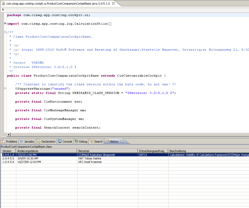 Für eine Java-Klasse oder eine Source-Datei können die vorhandenen Versionen angezeigt werden. Dazu ist unter dem Karteiereiter Package Explorer auf einem entsprechenden Eintrag das Kontextmenü zu öffnen. Im Kontextmenü ist unter dem Eintrag „Team“ ein weiteres Menü mit dem Eintrag Comarch-ERP-Enterprise-Versionen anzeigen verfügbar. Mit dieser Aktion werden die Versionen unter dem Karteireiter History angezeigt.