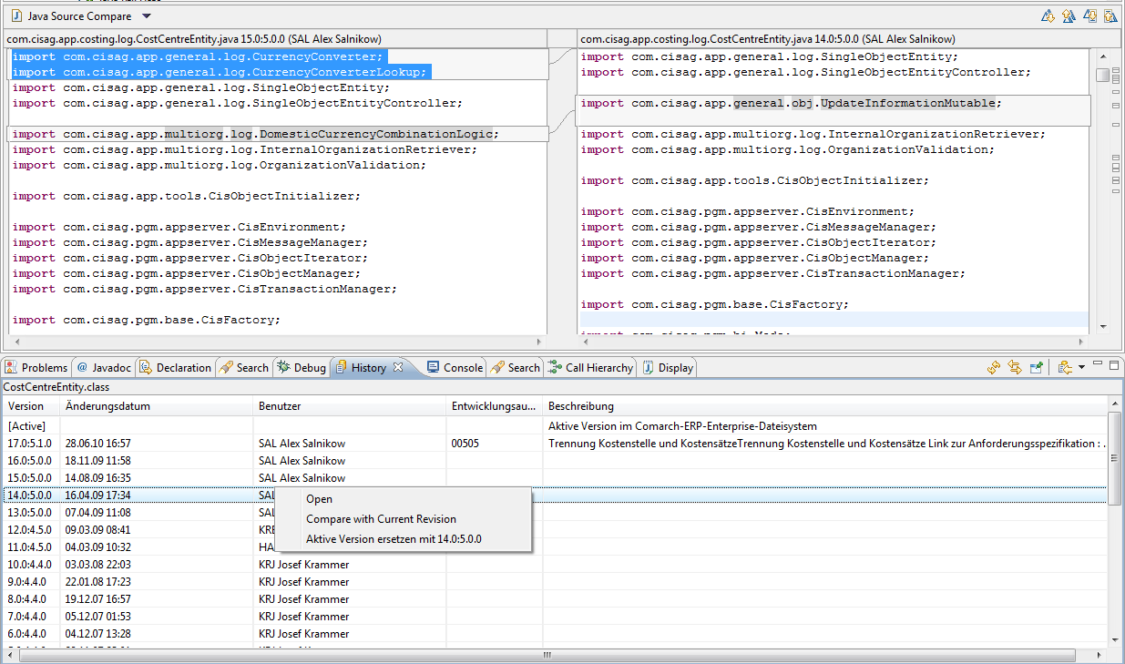 Wurden Java-Klassenversionen abgefragt, dann können zwei verglichen werden. Mithilfe des Eclipse-Vergleichswerkzeug werden die Differenzen dargestellt.