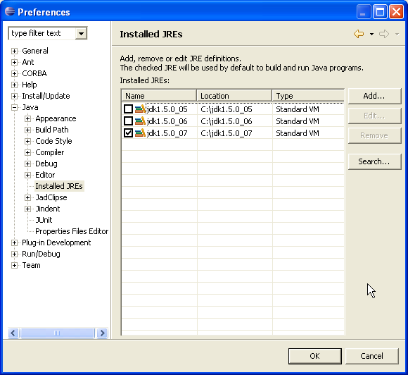 Als nächstes muss das JDK definiert sein. Die Definition erfolgt im Menü Windows/Preferences/Java/Installed JREs. Mit der Aktion Add kann das Standard-JDK definiert werden. Der Name des JDK soll immer auch die Updateversion enthalten, z. B. jdk1.6.0_35.