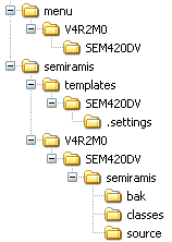 Für die Entwicklung wird eine einheitliche Ordnerstruktur vorausgesetzt. Bei einem Einzelplatz wird unter Windows das Ordner C:\semiramis erwartet. Unterhalb dieses Ordners gibt es pro Release ein Unterordner. Innerhalb der Ordner für die Releases gibt es pro System ein Ordner. Innerhalb des Ordners für das System gibt es ein Ordner semiramis in dem die Ordner source, für die Quellen, und classes, für die übersetzten Klassen, vorhanden sind. Auf einem Rechner, der von mehreren Benutzer gleichzeitig verwendet wird, z.B. ein Terminalserver, sollte pro Benutzer ein Home-Ordner als Laufwerk verbunden sein. In diesem Laufwerk ist dann die angegebene Ordnerstruktur zu finden.