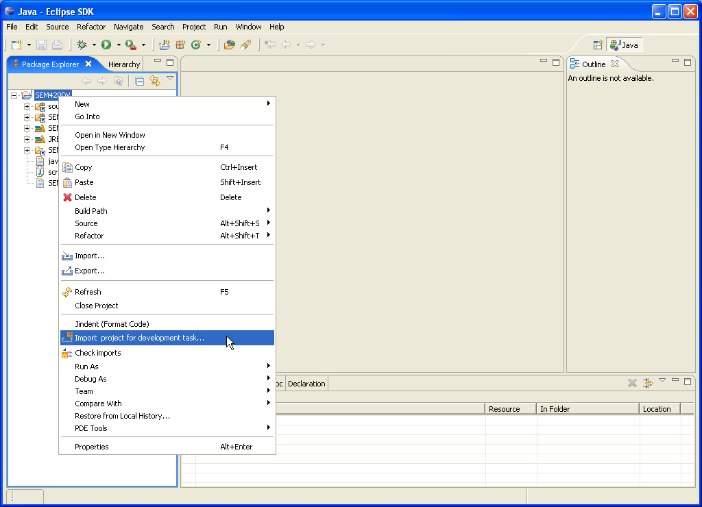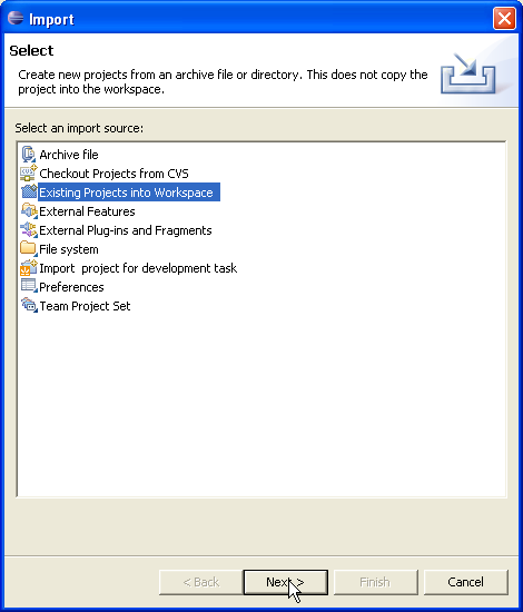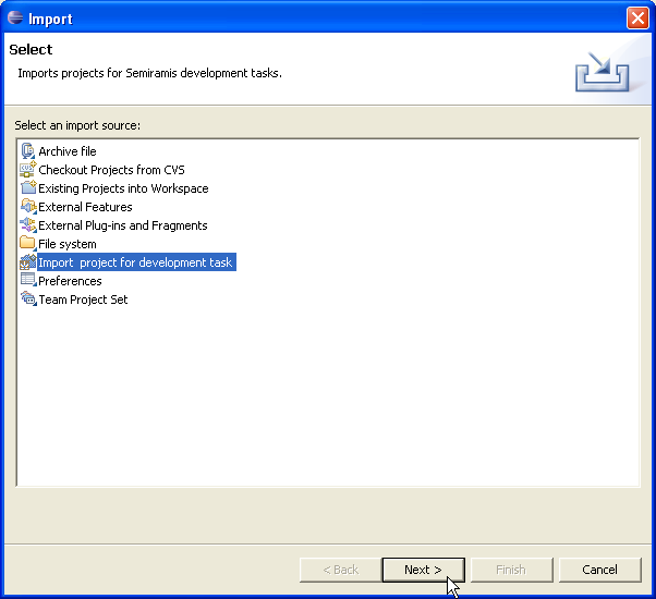 Alternativ kann im Import-Dialog-Fenster der Wizard Import project for development task gestartet werden.