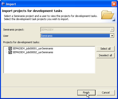 Auf dem Import-Dialog-Fenster kann nun die Entwicklungsaufgabe eines Benutzers importiert werden. Dazu muss ein Benutzer und die Entwicklungsaufgabe ausgewählt werden. Durch drücken des [Finish]-Buttons werden sowohl das common– als auch das Benutzer-Projekt importiert.