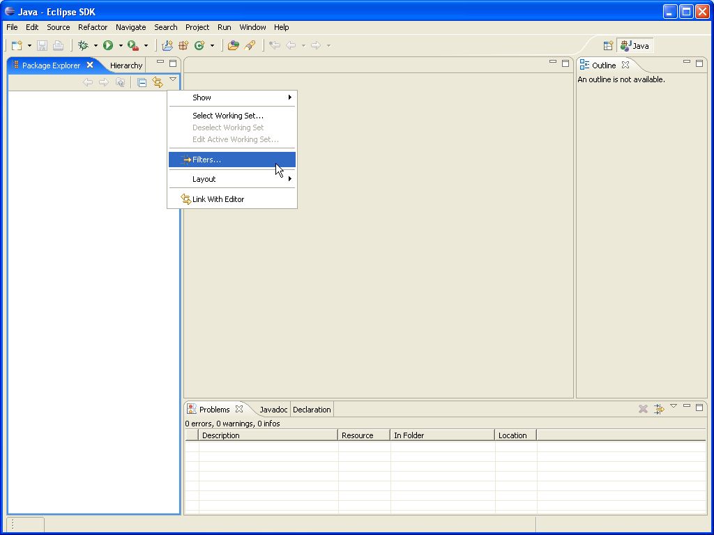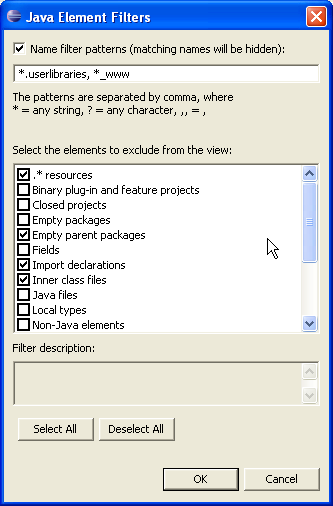 Die wichtigste Ansicht in der Java-Perspektive ist der Package-Explorer. Wenn Sie diese Ansicht nicht auf der linken Seite sehen, so kann dieser im Menü Window/Show View/Package Explorer hinzugefügt werden. Im Package Explorer wird ein Namensfilter für *.userlibraries und *_www empfohlen. Das Menü des Package Explorers kann der Filter definiert werden.
