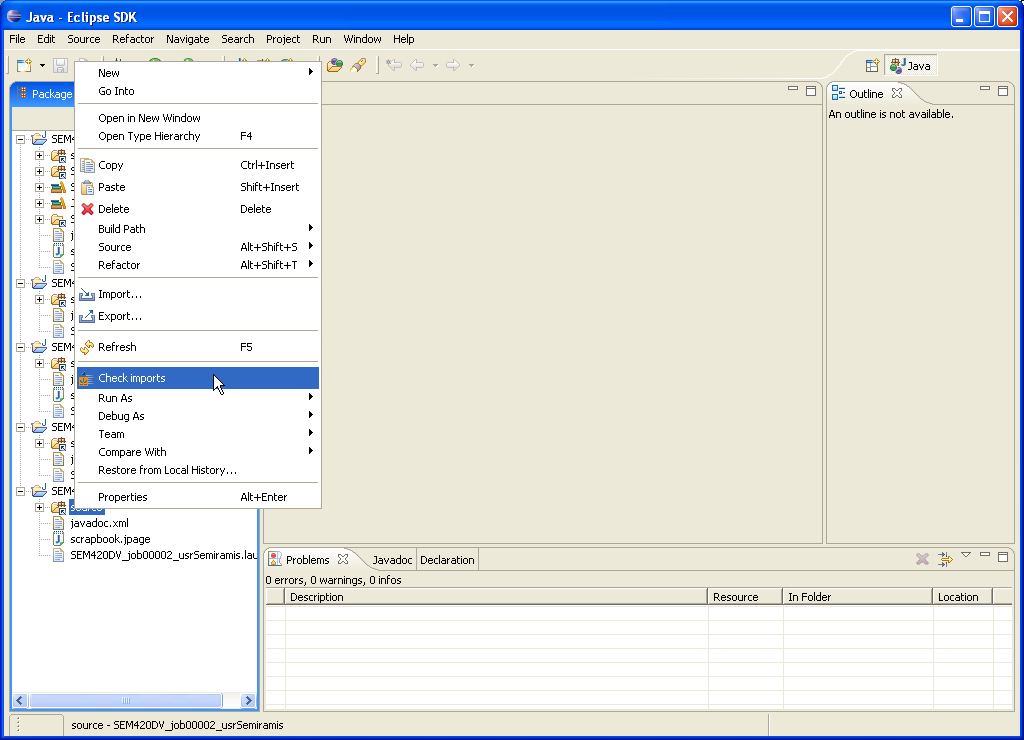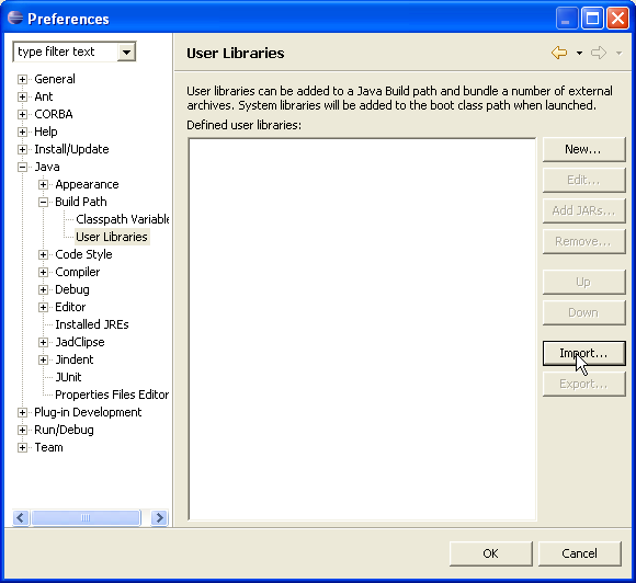 Das Eclipse-Projekt besteht aus mehreren Dateien. Diese Dateien wurden im Ordner C:\semiramis\templates\SEM420DV erzeugt. Bevor das Projekt importiert wird, muss die Benutzerbibliothek für das System importiert werden. Der Import erfolgt über das Menü Window/Preferences/Java/Build Path/User Libraries/Import.
