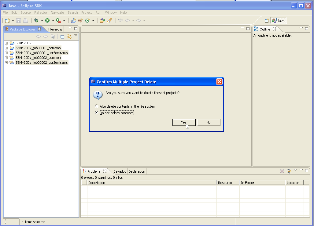 Gelegentlich muss ein Projekt aus dem Arbeitsbereich von Eclipse entfernt werden. Dazu muss das Projekt im Package-Explorer ausgewählt und die Entf-Taste betätigt werden. Es kann auch der Menüeintrag Delete im Kontextmenü des Projekts verwendet werden. Auf dem folgenden Bestätigungs-Dialog-Fenster muss unbedingt der Eintrag Do not delete contents ausgewählt sein, bevor das Dialog-Fenster mit [Yes] bestätigt wird.