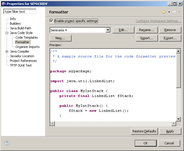 Aktivieren Sie die projektspezifischen Einstellungen durch die Check-Box Enable project specific settings. Importieren Sie die Formatierungseinstellungen durch das Drücken des Buttons [Import] und wählen Sie dann die Datei