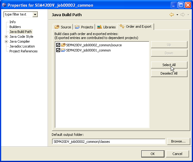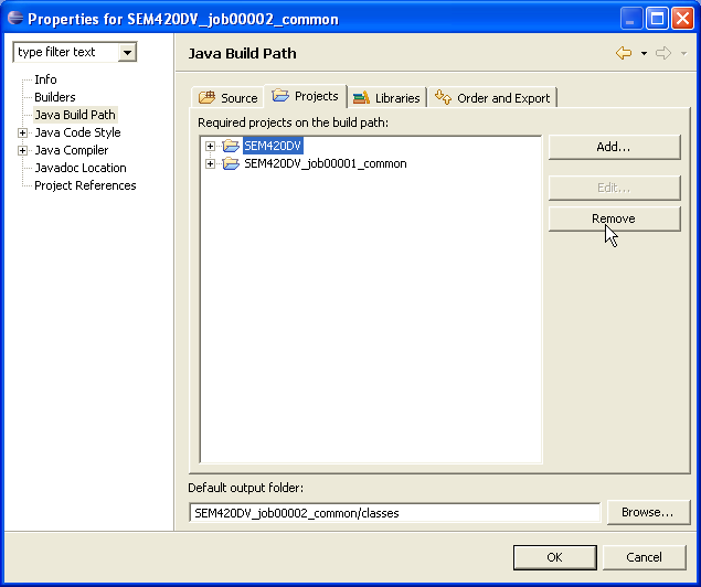 Das common-Projekt der abhängigen Entwicklungsaufgabe (2) muss eine Abhängigkeit zu dem common-Projekt der anderen Entwicklungsaufgabe (1) haben. Dazu müssen die Eigenschaften des abhängigen Projekts angepasst werden. Die Eigenschaften können durch den Menüeintrag Properties im Kontextmenü des Projektes geöffnet werden. Im Baum muss der Java Build Path, im Arbeitsbereich der Karteireiter Projects ausgewählt werden. Mit dem [Add]-Button muss das Projekt SEM420DV_job00001_common hinzugefügt und mit dem [Remove]-Button das Projekt SEM420DV entfernt werden.
