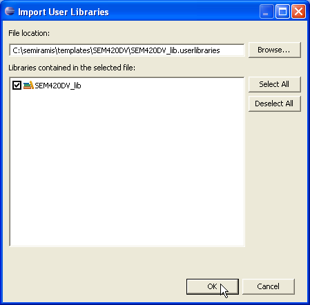 Die zu importierende Datei mit der Benutzerbibliothek für das Projekt heißt für das im vorherigen Kapitel gezeigte Beispiel C:\semiramis\templates\SEM420DV\SEM420DV_lib.userlibraries.