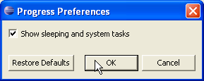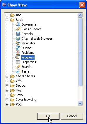 Gerade nach dem Hinzufügen eines Projektes oder dem Öffnen von Eclipse kann es vorkommen, dass die Reaktionszeiten von Eclipse nicht den Erwartungen entsprechen. Ob Eclipse im Hintergrund beschäftigt ist oder nicht, kann der Ansicht Progress entnommen werden. Im Menü Window/Show View/Other… kann die Ansicht ausgewählt werden. Die Ansicht ist im Baum unter dem Ordner Basic zu finden.