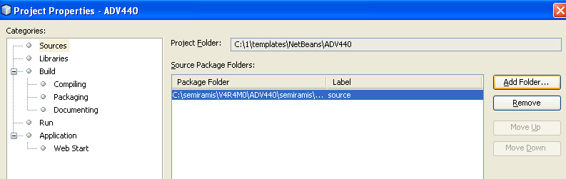 Der Befehl crtdvf erzeugt die Projekt-Dateien in einem Ordner templates/NetBeans das ein Unterordner des Ordners ist, das mit dem Parameter templatesDir angegeben wird. Das Projekt muss geöffnet werden (Menü File->Open Project-> Open Project_Button). In dem Beispiel navigiert man im Dialog-Fenster Open Project zu dem Projekt-Ordner C:\semiramis\templates\NetBeans\ADV440. Der Projekt-Bereich sieht dann folgendermaßen aus:
