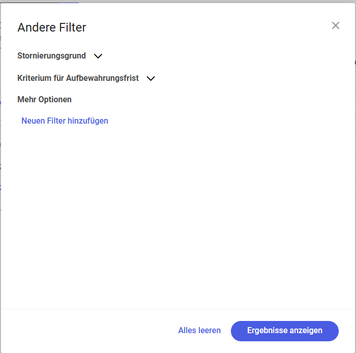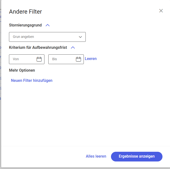 - Es wurden Expander für die Felder „Stornierungsgrund“ und „Kriterium für Aufbewahrungsfrist“ hinzugefügt – standardmäßig werden die Liste der Stornierungsgründe und die Felder, in denen die Daten für das Kriterium für Aufbewahrungsfrist eingegeben werden, ausgeblendet. Neben den Feldern wurde ein Abwärtspfeil-Icon