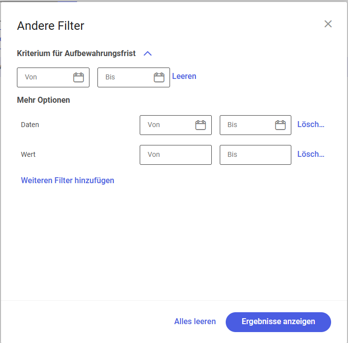 In der Version 2026.0.0 wurden folgende Änderungen im Fenster „Andere Filter“ eingeführt, das im Modul Archive in der Web-Anwendung sowie während des Hinzufügens eines Anhangs aus dem Archive in der Desktop-Anwendung verfügbar ist: