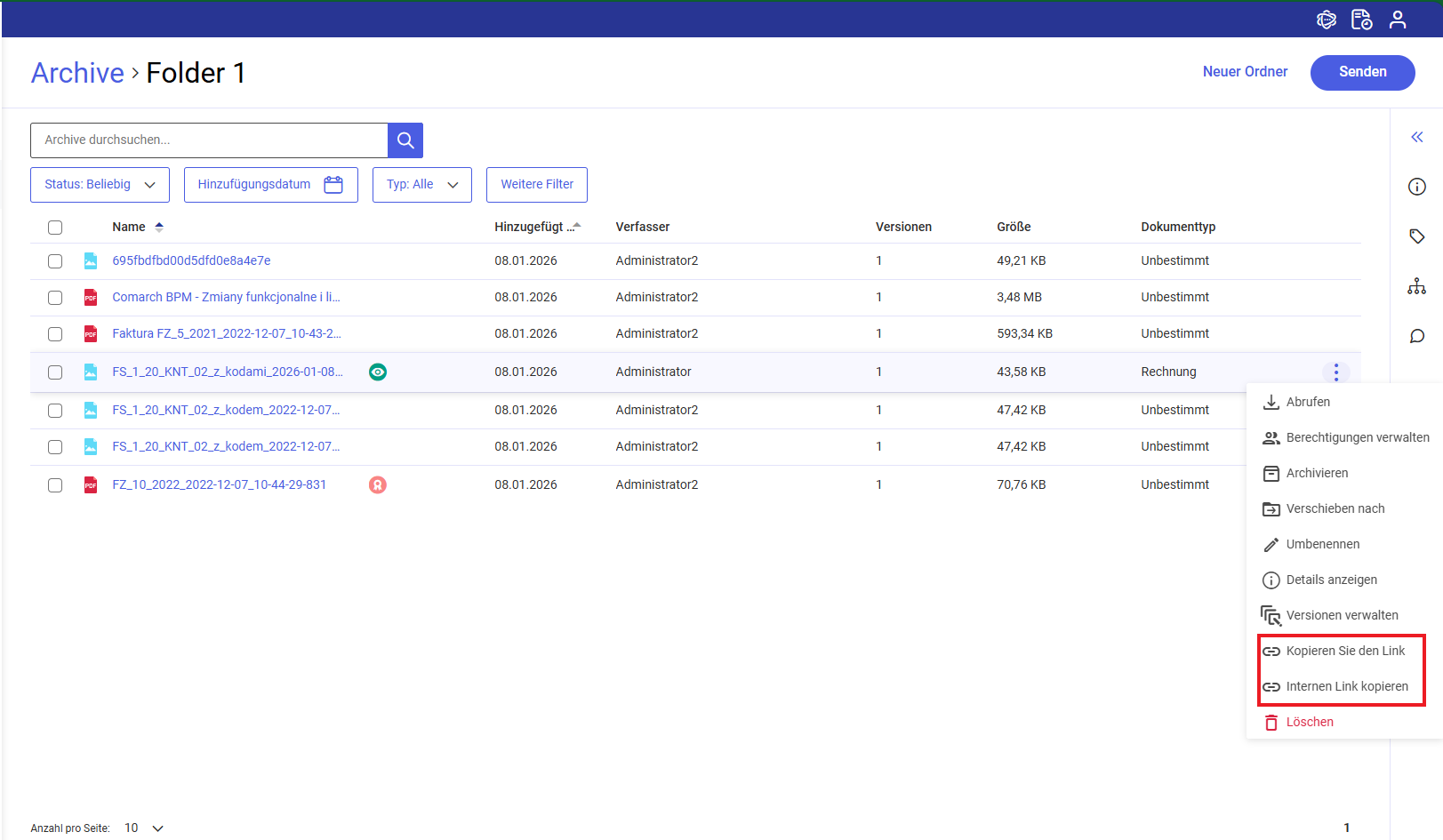 Beide Optionen zum Kopieren von Links sind für alle Dokumente (aktive, archivierte, stornierte) verfügbar).