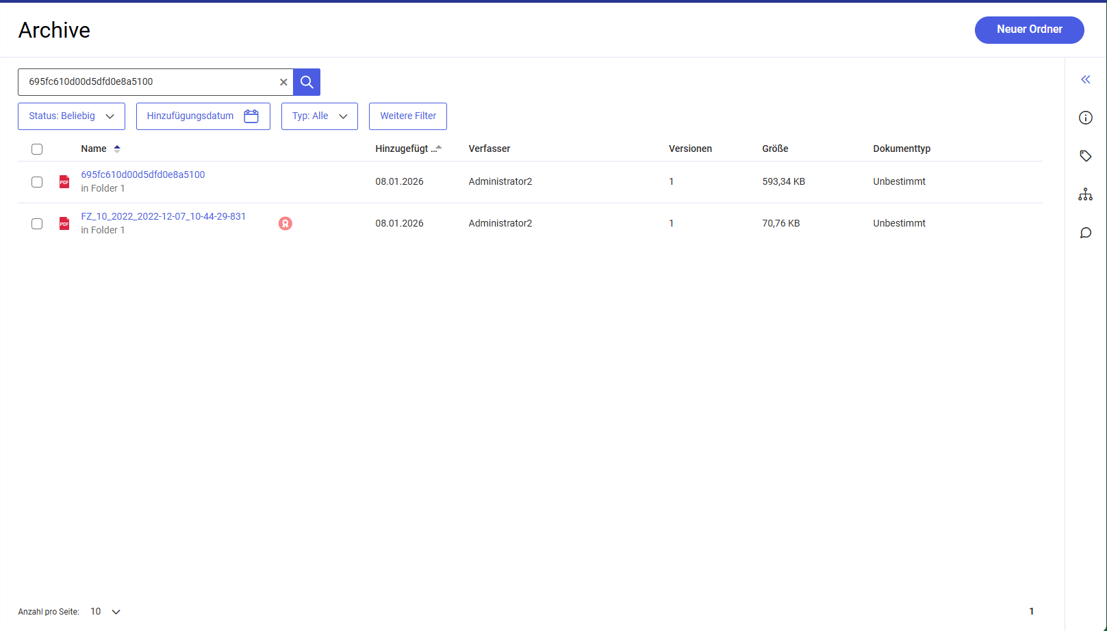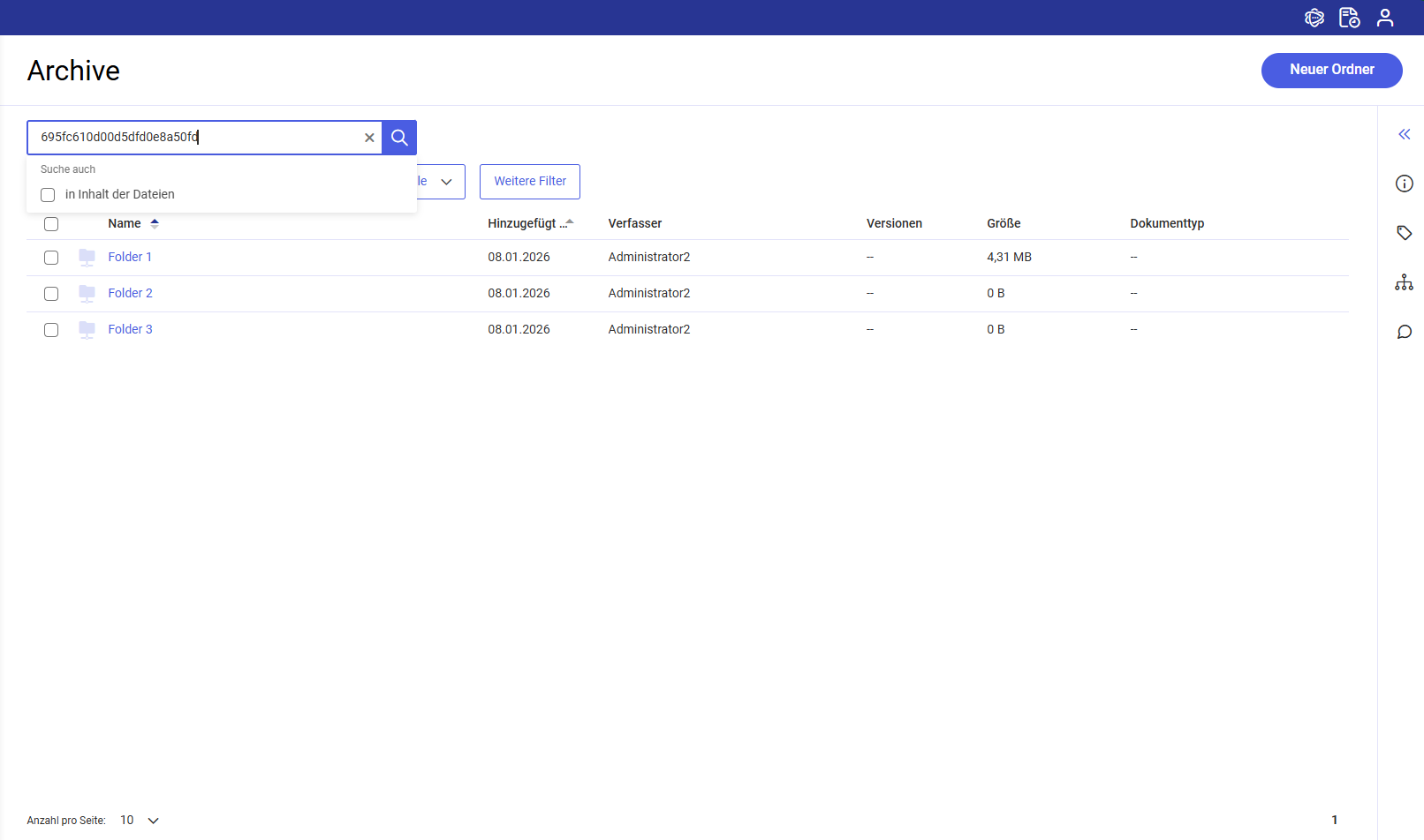 Falls sich im Modul Archive ein Dokument befindet, das denselben Namen hat wie der Identifikator (interner Link) eines anderen Dokuments, werden nach der Suche nach dem jeweiligen Identifikator im Archive beide Positionen in der Ergebnisliste angezeigt.