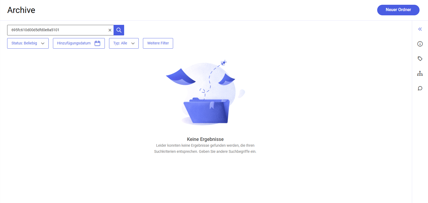 Wenn das Dokument mit der jeweiligen UUID-Nummer nicht gefunden wird, wird die Information „Keine Ergebnisse“ angezeigt.
