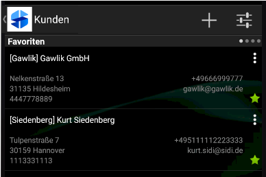 Die Kennzeichnung erfolgt in der Kundenkarte und ist nur in der Anwendung Mobile Sales möglich (keine Synchronisierung mit ERP-System). Der als Favorit gekennzeichnete Kunde wird in der Kundenliste -> Registerkarte: Favoriten angezeigt.
