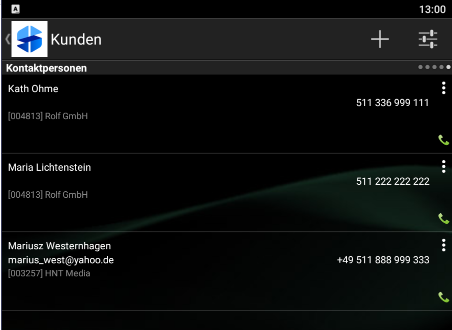 Die Liste Kontaktpersonen dient als Telefonbuch, in dem Außendienstler die gewünschten Ansprechpartner schnell und einfach finden und einen Kontakt mit ihnen aufnehmen können – per E-Mail, Telefon oder SMS. Für jeden Ansprechpartner werden entsprechende Kontaktdaten angezeigt: