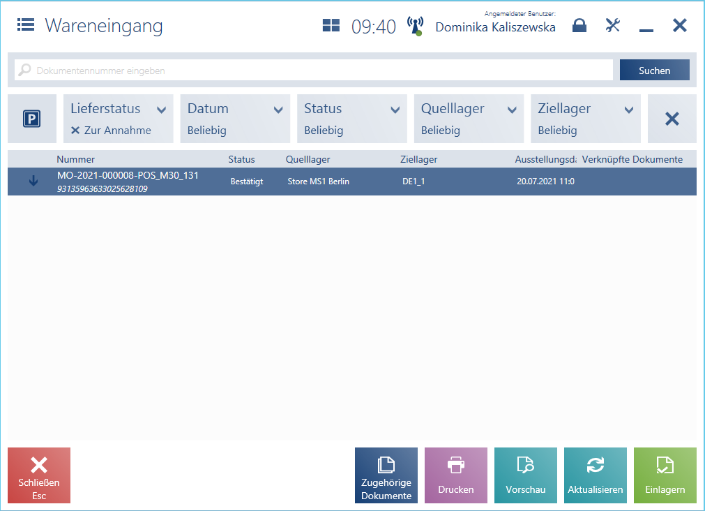- Lieferung über den Button [Annehmen] einlagern