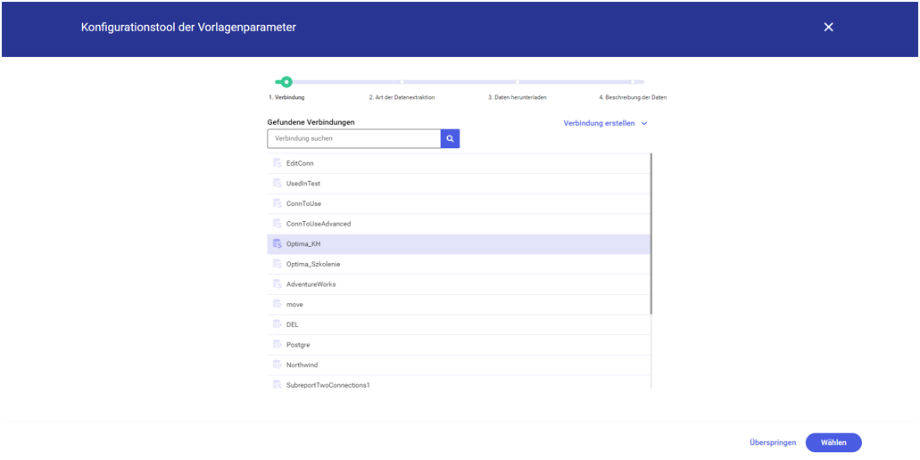 Im ersten Schritt des Konfigurationstools der Vorlagenparameter wird eine Verbindung zur Datenbank ausgewählt. In diesem Schritt können Sie eine der drei Optionen verwenden: diesen Schritt überspringen, eine bestehende Verbindung suchen oder eine neue Verbindung erstellen.